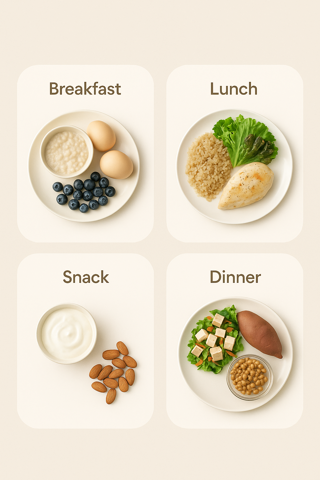- 단백질: 근육 유지 + 포만감 (계란, 닭가슴살, 두부, 콩류)