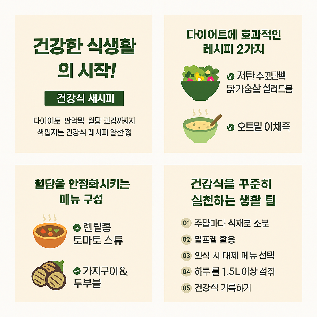 “건강은 식탁에서 시작된다.” 이 말은 더 이상 선택이 아닌 필수입니다. 불규칙한 식사, 가공식품, 고염·고지방 위주의 현대식단은 다양한 질병의 원인이 되고 있습니다. 이 글에서는 다양한 건강 목표에 맞춘 실속 건강식 레시피와 식단 구성법을 단계별로 소개합니다.